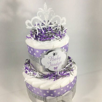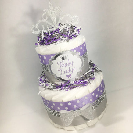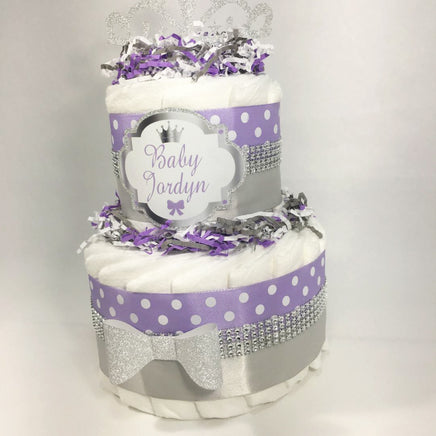 Cute 2-tier diaper cake centerpiece for your princess themed baby shower! Color scheme is lilac, gray, silver, and white with some silver-toned rhinestones. If you would like me to replace "Welcome Little Princess" with something else, please leave a note during checkout. Also available in lilac and gold.