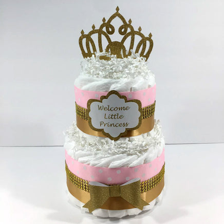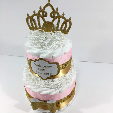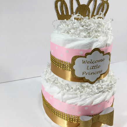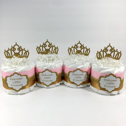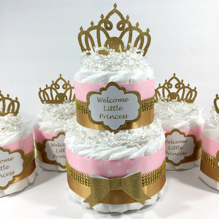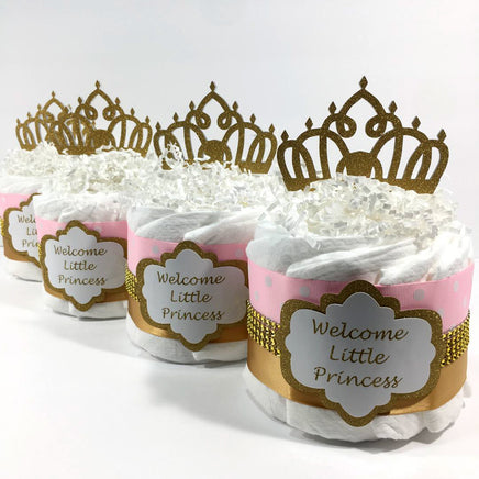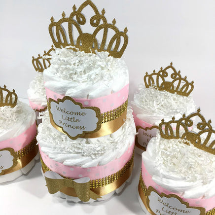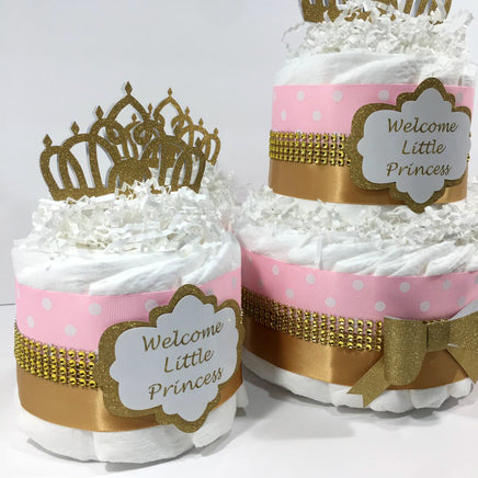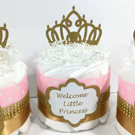 Welcome little princess themed baby shower diaper cake centerpieces. These princess diaper cakes are decorated with pink with white polka dot ribbons and gold satin ribbons and are embellished with gold-toned rhinestones. The tag reads "Welcome Little Princess" but you can request it say something else. Each diaper cake is topped with a glitter paper tiara topper.