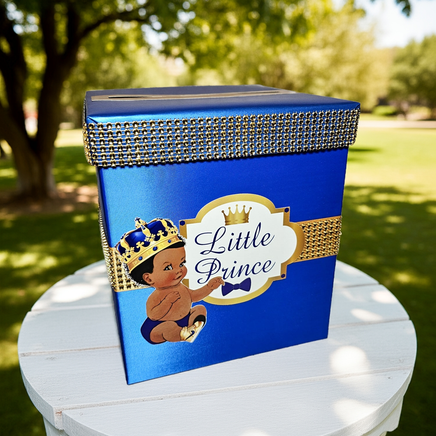 Royal blue and gold little prince baby shower card box for a boy baby shower.