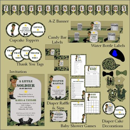 Printable green camouflage little soldier baby shower decorations pack. Purchase as a bundle and save money. Multiple baby boy shades available.