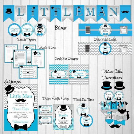Printable little man baby shower decorations pack. Can also be edited for a little man themed birthday party. Download and print as many as you need.