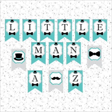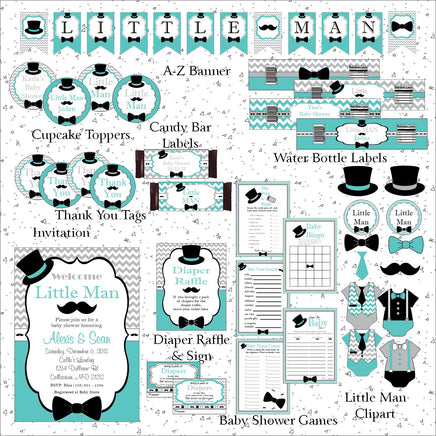 Printable teal and gray little man themed baby shower decorations pack. Purchase as a bundle and save money.