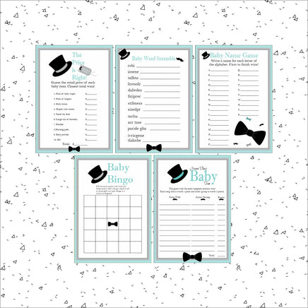 ~ Little Man baby shower game sheets ~ Baby Bingo, Price is Right, Word Scramble, Baby Name Game, Name That Baby Tune