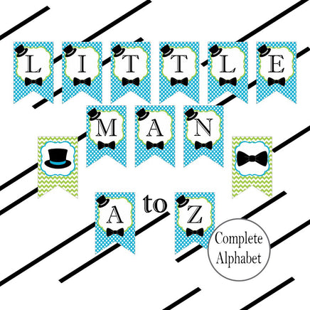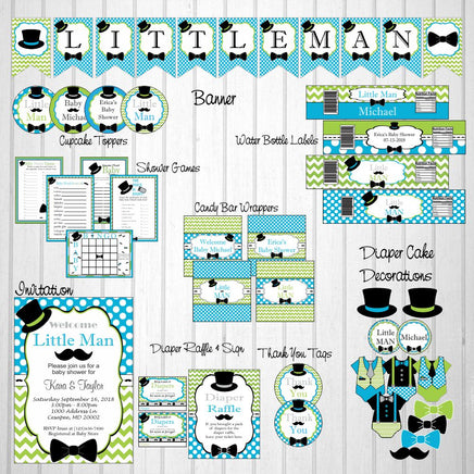 Printable turquoise, lime green, gray, and black little man themed baby shower decorations.