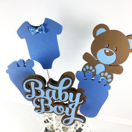 5 piece baby bear centerpiece sticks for your boy baby shower. The default color scheme is blue and brown but you can request other colors.