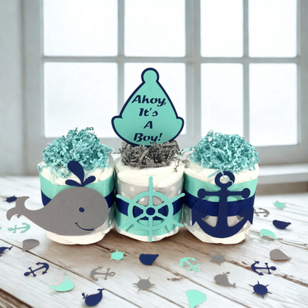 Ahoy, it's a boy! Nautical and whale mini diaper cake centerpiece set. The default color scheme is navy, aqua, and gray but you can request different colors.