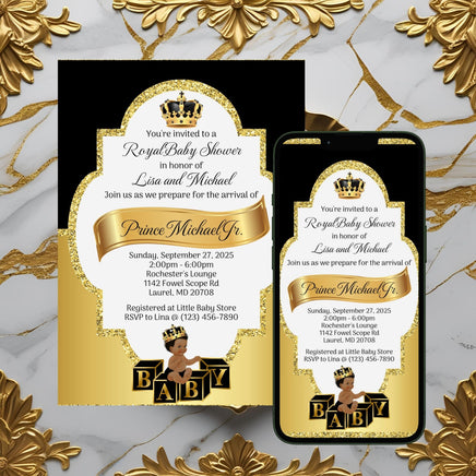 Self editable black and gold digital and printable little prince baby shower invitation set.