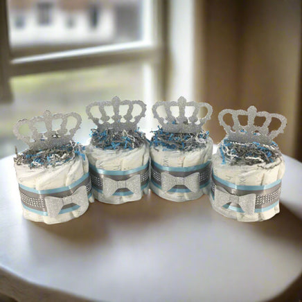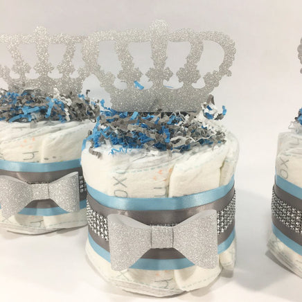 Blue and silver little prince mini diaper cake centerpieces.