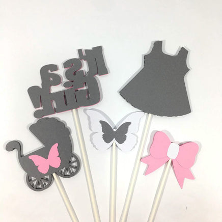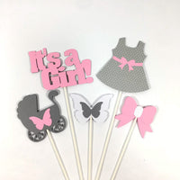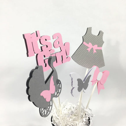 Pink & gray 5 piece "It's a Girl" centerpiece sticks for a girl baby shower.