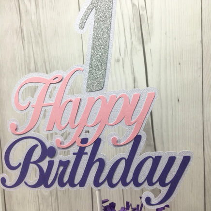 Default topper shows light pink, black, lavender, and white with the number 1 and is made from layered cardstock paper assembled to wooden sticks. The back is solid.