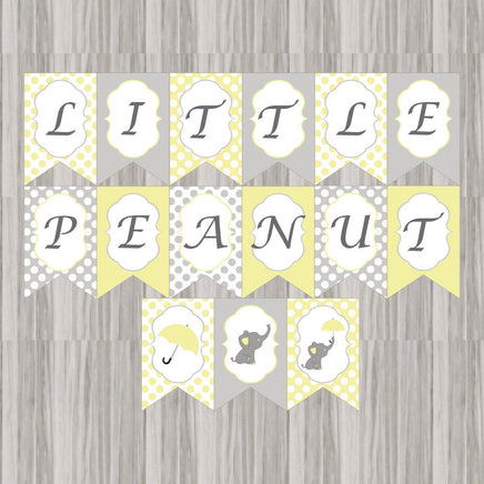 Printable Little Peanut elephant baby shower banner with a yellow and gray color scheme.