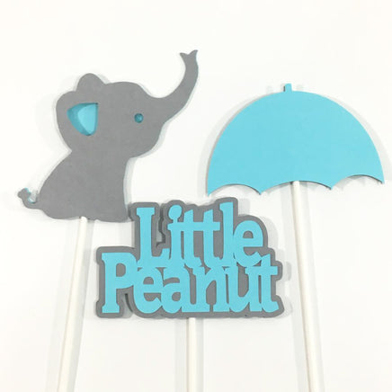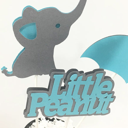Light teal and gray Little Peanut centerpiece sticks or vase toppers for a boy baby shower. These centerpiece sticks are a great addition to a bouquet centerpiece.