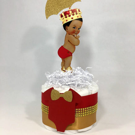 Set of 2 mini diaper cake centerpieces with a large baby boy holding an umbrella topper. These diaper cakes can be placed in the center of guest tables, the entry table, or where ever you desire.