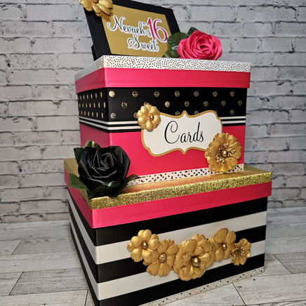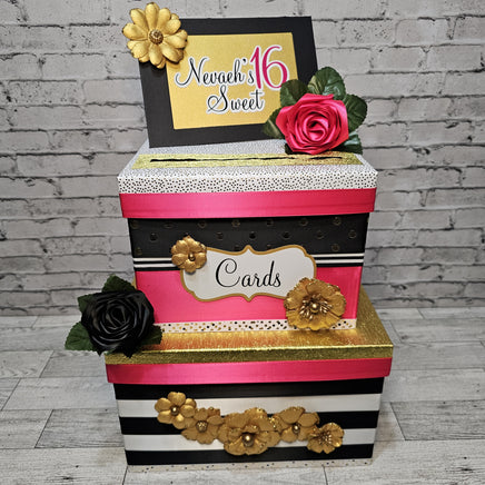 Pink, black, gold, and white card box for a sweet 16 birthday party.