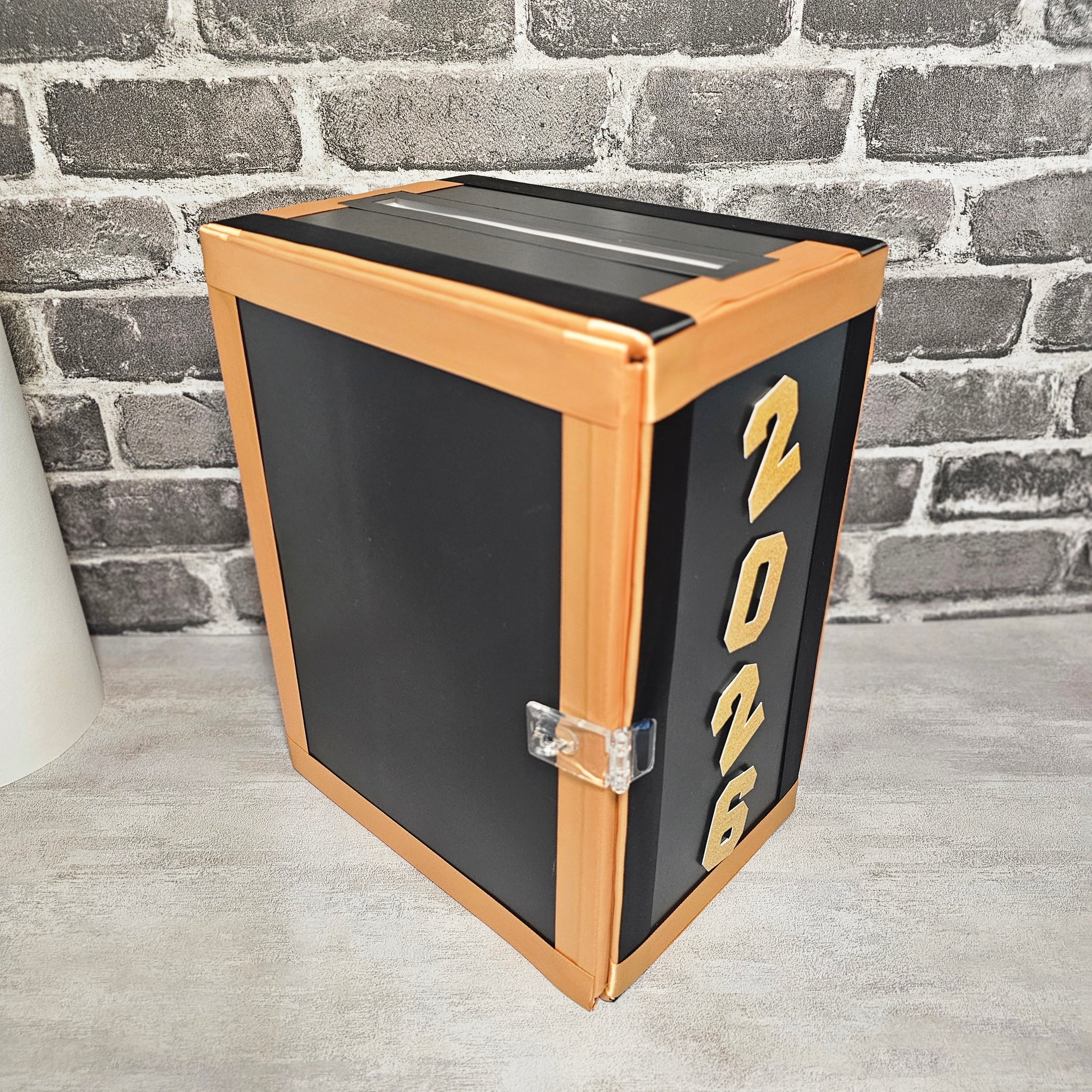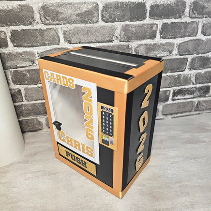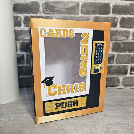 Vending machine style gift card box for a graduation party. Box can be personalized with your graduate's name, year, school, etc. (no logos). Card box opens from the back and can be locked. Great as a gift and keepsake for your new grad!