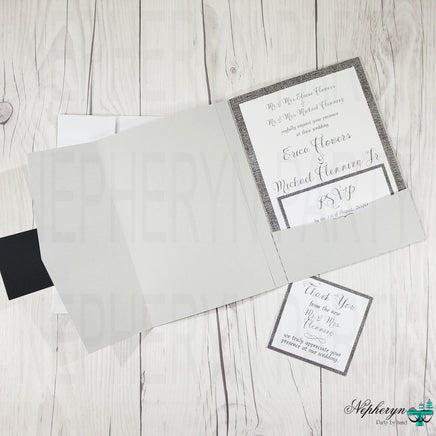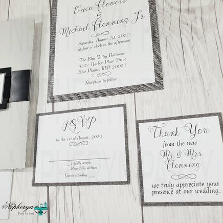 Wedding invitation set with a gray, white, and black color scheme. You can select to receive just the invite or the whole set as well as the digital download or printed and shipped invites.
