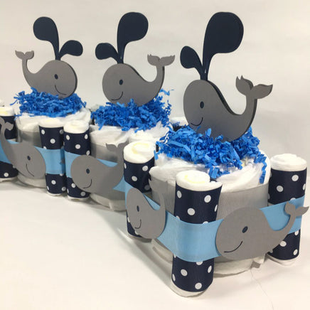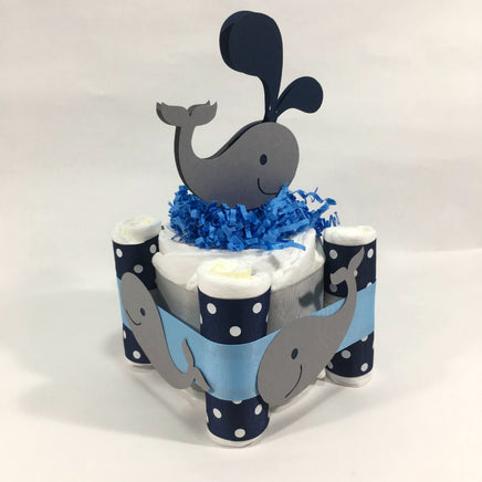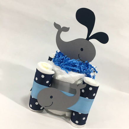 Baby whale 1-tier diaper cake for a whale or nautical themed boy baby shower. The diaper cakes can be placed at the center of guest tables. Whale diaper cake is decorated with gray, navy blue, and baby blue ribbon but you can request custom colors.