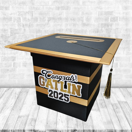 Black and antique gold graduation cap style foldable card box with a tassel. Box is great for cards up to 5"x7", money, notes, and other well wishes. The top is made from chipboard and paper and can be used as a guest signing "sheet". Please consider the size of this box and the needs of your party. To avoid mistakes and misunderstandings, please read listing carefully. If something is not clear, please contact me with any questions.