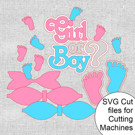 Instant digital download these gender reveal svg file cutouts to make your own gender reveal diaper cake centerpiece. The cutouts include "Girl or Boy?", a bow tie, bow with tail, and baby feet.