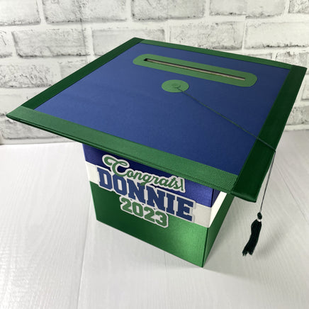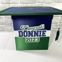 Navy blue, green, and white graduation cap style foldable card box with a tassel. Box is great for cards up to 5"x7", money, notes, and other well wishes. The top is made from chipboard and paper and can be used as a guest signing "sheet". Please consider the size of this box and the needs of your party. To avoid mistakes and misunderstandings, please read listing carefully. If something is not clear, please contact me with any questions.