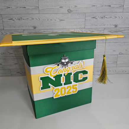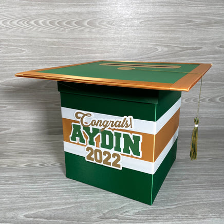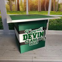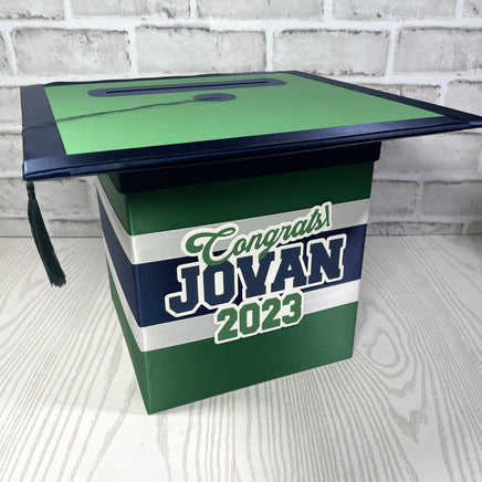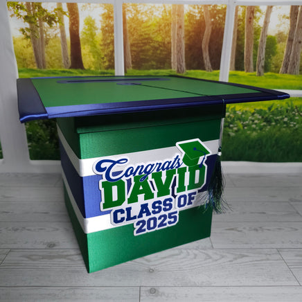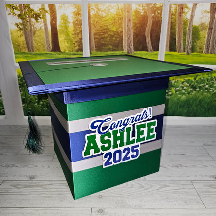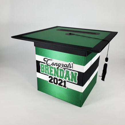 Style 1 graduation card box with forest green as the prominent color. Many other color combinations available to match your party.