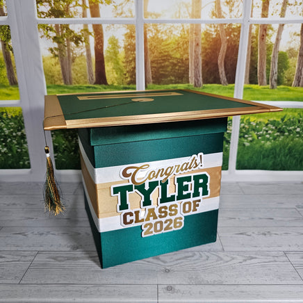 Style 1 graduation card box with hunter green as the prominent color. Many other color combinations available to match your party.