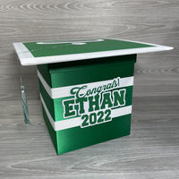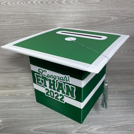 Green and white graduation cap style foldable card box with a tassel. Box is great for cards up to 5"x7", money, notes, and other well wishes. The top is made from chipboard and paper and can be used as a guest signing "sheet". Please consider the size of this box and the needs of your party. To avoid mistakes and misunderstandings, please read listing carefully. If something is not clear, please contact me with any questions.