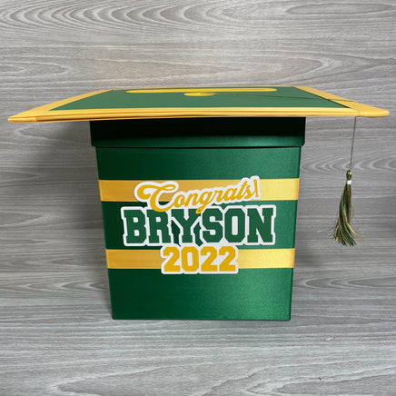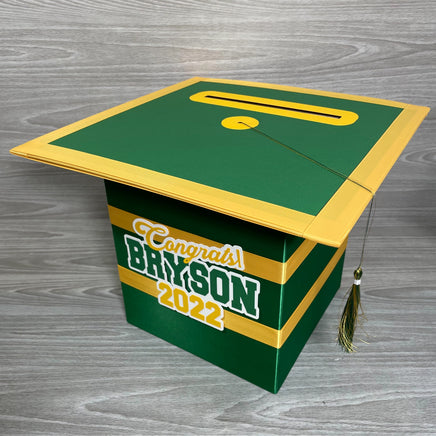 Kelly green and yellow gold graduation cap style foldable card box with a tassel. Box is great for cards up to 5"x7", money, notes, and other well wishes. The top is made from chipboard and paper and can be used as a guest signing "sheet". Please consider the size of this box and the needs of your party. To avoid mistakes and misunderstandings, please read listing carefully. If something is not clear, please contact me with any questions.