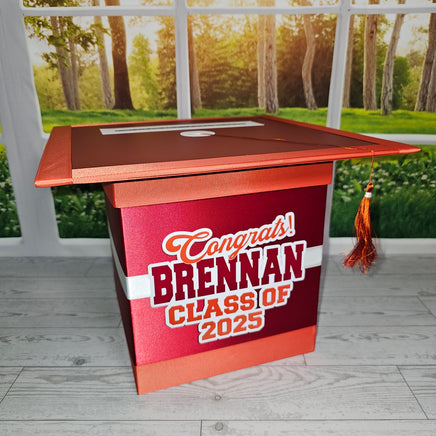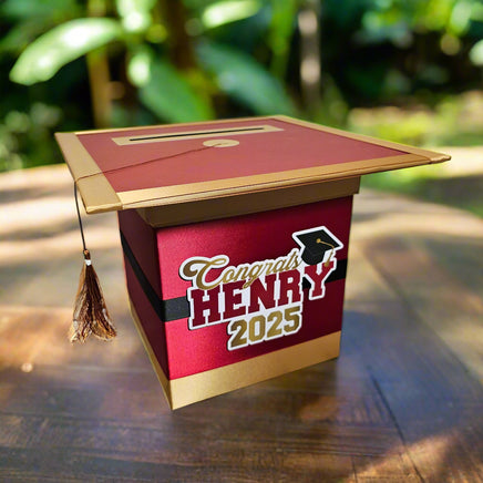 Style 3 graduation card box with maroon as the prominent color. This box works best with 3 colors but can also work with 2.