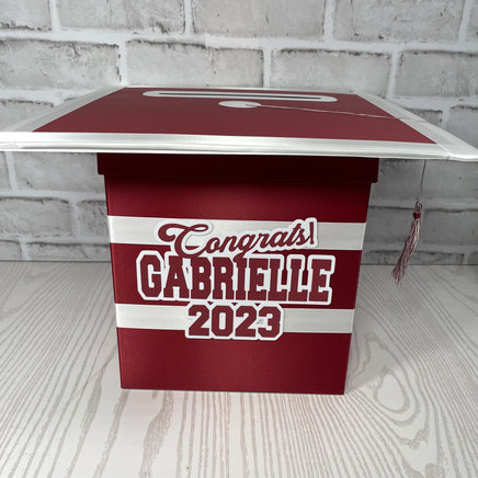 Maroon and white graduation cap style foldable card box with a tassel. Box is great for cards up to 5"x7", money, notes, and other well wishes. The top is made from chipboard and paper and can be used as a guest signing "sheet". Please consider the size of this box and the needs of your party. To avoid mistakes and misunderstandings, please read listing carefully. If something is not clear, please contact me with any questions.