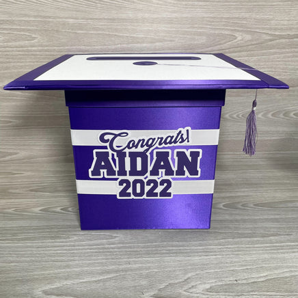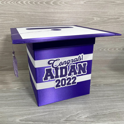Regal purple and white graduation cap style foldable card box with a tassel. Box is great for cards up to 5"x7", money, notes, and other well wishes. The top is made from chipboard and paper and can be used as a guest signing "sheet". Please consider the size of this box and the needs of your party. To avoid mistakes and misunderstandings, please read listing carefully. If something is not clear, please contact me with any questions.