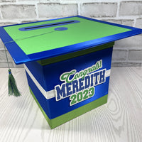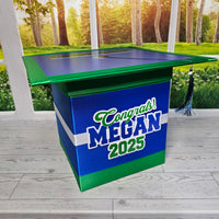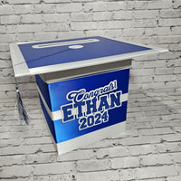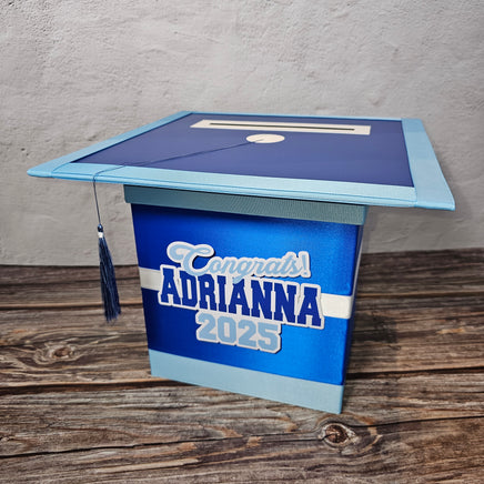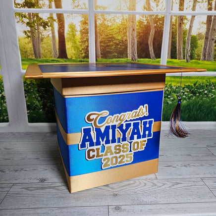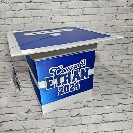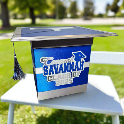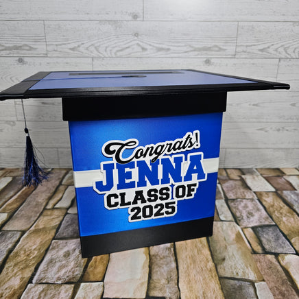 Style 3 graduation card box with royal blue as the prominent color. This box works best with 3 colors but can also work with 2.