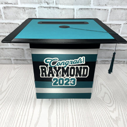 Dark teal, black, and silver graduation cap style foldable card box with a tassel. Box is great for cards up to 5"x7", money, notes, and other well wishes. The top is made from chipboard and paper and can be used as a guest signing "sheet". Please consider the size of this box and the needs of your party. To avoid mistakes and misunderstandings, please read listing carefully. If something is not clear, please contact me with any questions.