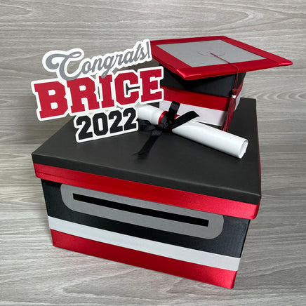 Black, red, gray, and white card box for a graduation party. This box is 10x10x6" with a mini box on top in the style of a graduation cap. It also includes a topper with the name and graduation year of your graduate as well as a mock diploma. If you want special wording on the "diploma" please include that information in the note box when ordering. The full size is 10x10x9.5". Many colors to choose from to match your school of choice. Please consider the size of this box and the needs of your party. To avoid mistakes and misunderstandings, please read listing carefully. If something is not clear, please contact me with any questions.
