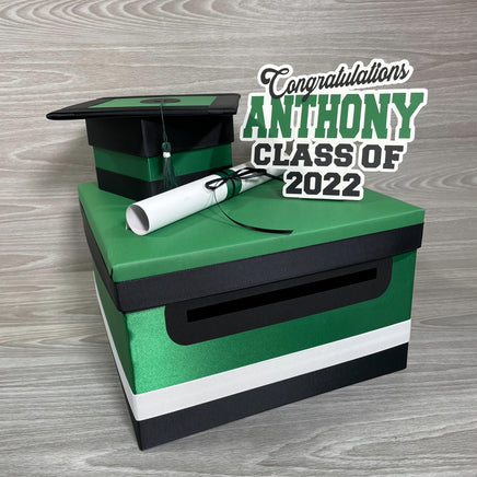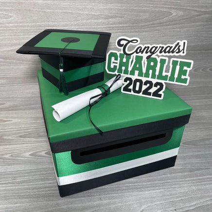 Kelly green, black, and white card box for a graduation party. This box is 10x10x6" with a mini box on top in the style of a graduation cap. It also includes a topper with the name and graduation year of your graduate as well as a mock diploma. The full size is 10x10x9.5". Many colors to choose from to match your school of choice. Please consider the size of this box and the needs of your party. To avoid mistakes and misunderstandings, please read listing carefully. If something is not clear, please contact me with any questions.
