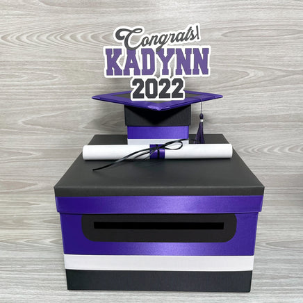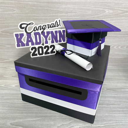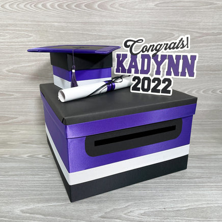 Regal purple, black, and white card box for a graduation party. This box is 10x10x6" with a mini box on top in the style of a graduation cap. It also includes a topper with the name and graduation year of your graduate as well as a mock diploma. The full size is 10x10x9.5". Many colors to choose from to match your school of choice. Please consider the size of this box and the needs of your party. To avoid mistakes and misunderstandings, please read listing carefully. If something is not clear, please contact me with any questions.