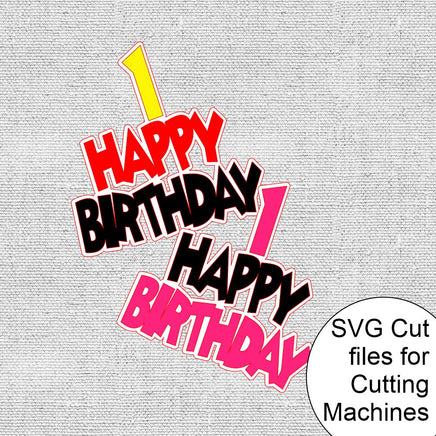 Instant digital download Happy Birthday (wacky font) SVG cutouts that you can use to make your own decorations. The cutouts include a "Happy" sign, a "Birthday" sign, a "1", and a back for the pieces to be glued to.