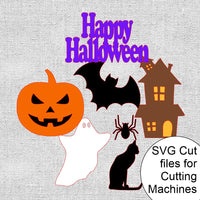 Instant digital download Happy Halloween SVG cutouts that you can use to make your own decorations. The cutouts include pieces for a "Happy Halloween" sign, a haunted house, a pumpkin, a bat, a ghost, a spider, and a cat. The files can be separated and resized to fit your needs. I use my Silhouette to cut the files but they can also work with Cricut.