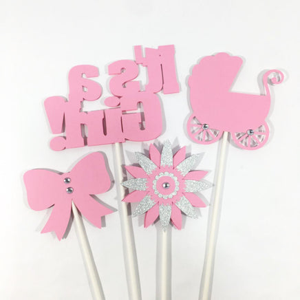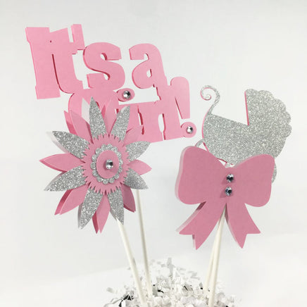 "It's A Girl" centerpiece sticks or cake toppers for a girl baby shower.