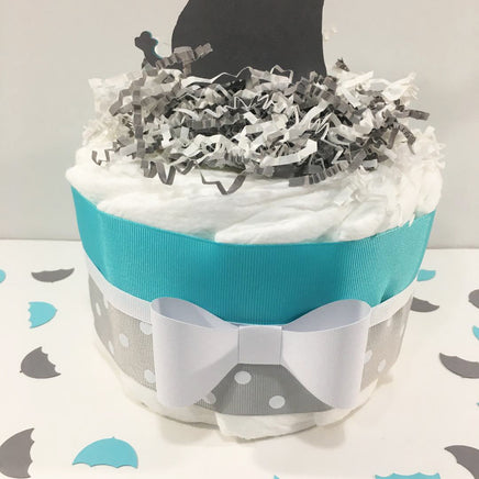 Along with the pre-decorated diaper cake, you will receive a 5.25" elephant topper and robin blue and gray umbrella paper confetti.