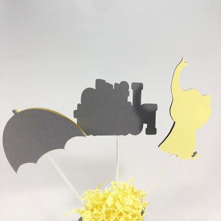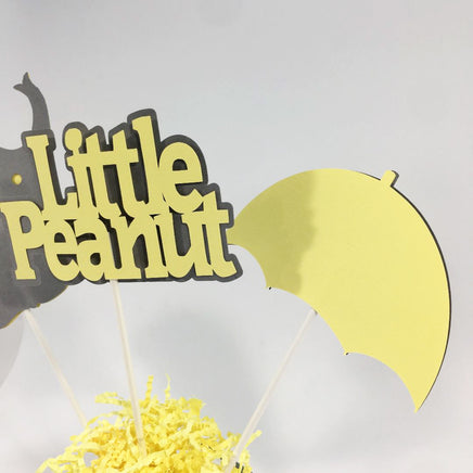 Yellow and gray Little Peanut centerpiece sticks or vase toppers for a gender neutral baby shower. These centerpiece sticks are a great addition to a bouquet centerpiece.