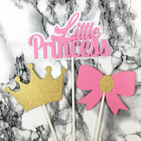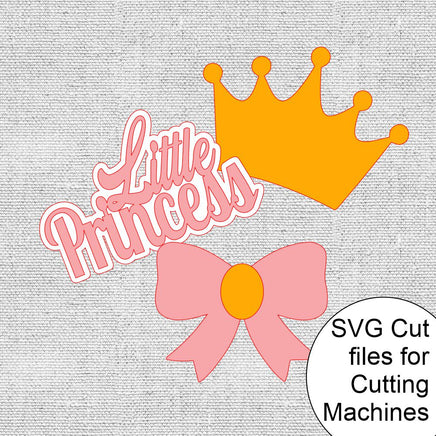 Instant digital download Little Princess SVG cutouts that you can use to make your own decorations. The cutouts include a "Little Princess" sign with back, a crown, and a bow.