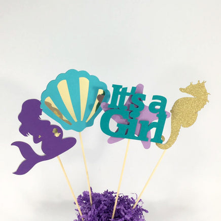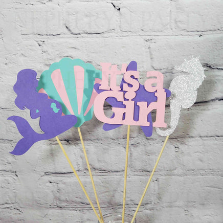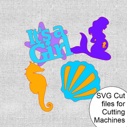 Instant digital download It's a Girl mermaid baby shower SVG cutouts that you can use to make your own decorations. The cutouts include pieces for an "It's a Girl" sign, a mermaid, a seahorse, and a clam shell.