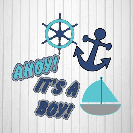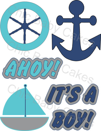 Download, print, and cut your own diaper cake toppers and tags with this printable decorations set. You will receive a file with an image of an anchor, a ship wheel, a boat, and words "AHOY" and "IT'S A BOY!"