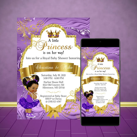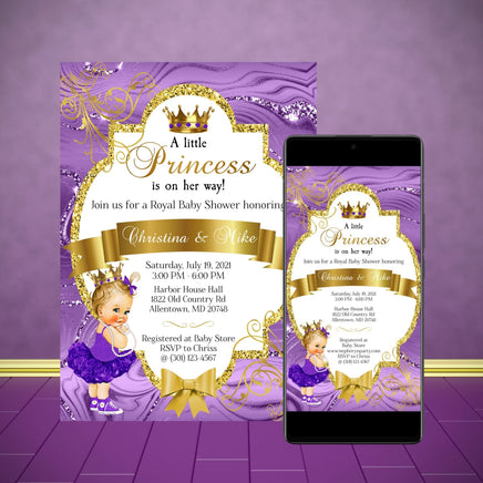Self editable purple and gold printable little princess baby shower bundle.
