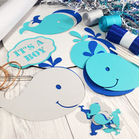 3 tier baby whale diaper cake kit for a boy baby shower. Color scheme is royal/cobalt blue, teal/turquoise (tealquoise) blue, gray, and white.